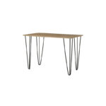 La mesa de la línea industrial es un producto logrado mediante la combinación de melamina símil madera color Atakama y las patas negras de hierro maciza.