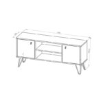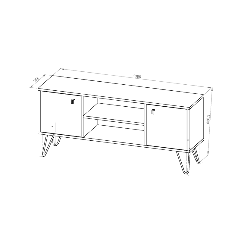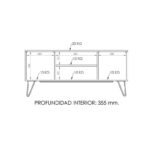Este mueble posee tres divisiones internas, dos cerradas con puertas y una libre, con la intención de tener un espacio para colocar los artefactos que tengan controles remotos. Cuenta con tiradores de color negro los cuales acompañan con la estética del diseño.